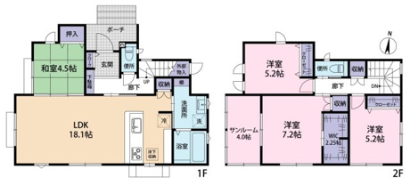 4LDK 1F/LDK 18.1帖 1室 1F/和室 4.5帖 1室 2F/洋室 7.2帖 1室 2F/洋室 5.2帖 2室 |