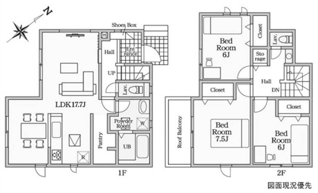3LDK 1F/LDK 17.7帖 1室 2F/洋室 7.5帖 1室 2F/洋室 6.0帖 2室 |