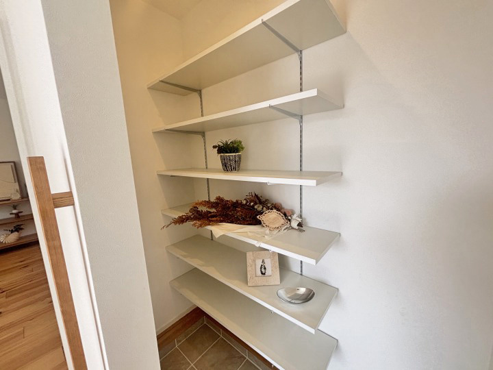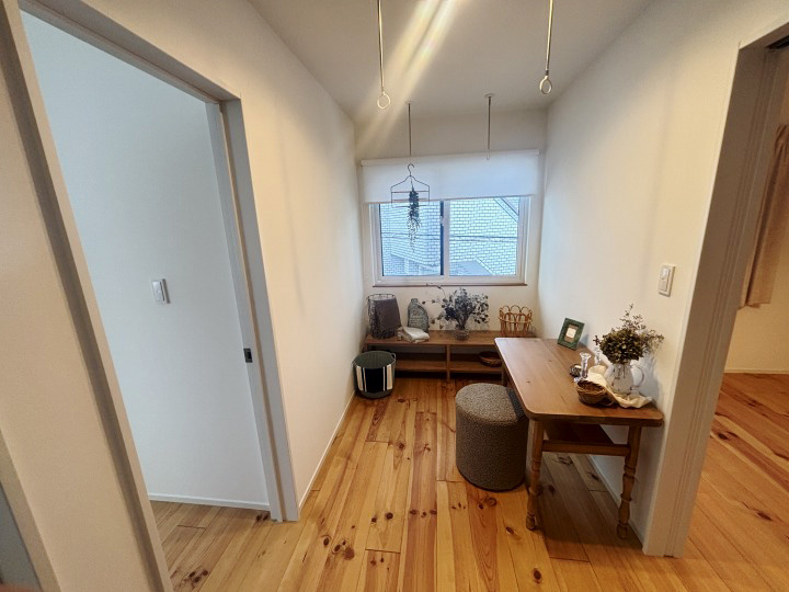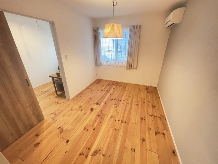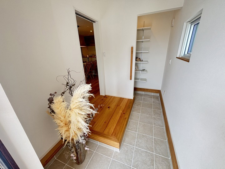 玄関土間には磁器質タイル、外壁は漆喰仕上げ、床にはパイン無垢材を使用し、素材の温もりを感じる設計です。