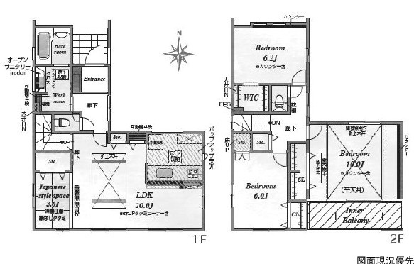 3LDK 1F/LDK 20.0帖 1室 2F/洋室 10.0帖 1室 2F/洋室 6.2帖 1室 2F/洋室 6.0帖 1室 ●LDK20帖には3帖タタミコーナー含む |