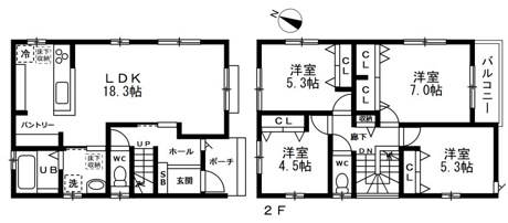 4LDK 1F/LDK 18.3帖 1室 2F/洋室 7.0帖 1室 2F/洋室 5.3帖 2室 2F/洋室 4.5帖 1室 |