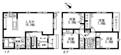 4LDK 1F/LDK 18.3帖 1室 2F/洋室 7.0帖 1室 2F/洋室 5.3帖 2室 2F/洋室 4.5帖 1室 |
