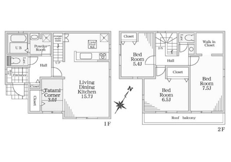 4LDK+1S(納戸) 1F/LDK 15.7帖 1室 1F/S 3.0帖 1室 2F/洋室 7.5帖 1室 2F/洋室 6.5帖 1室 2F/洋室 5.4帖 1室 ●1階納戸:タタミコーナー |