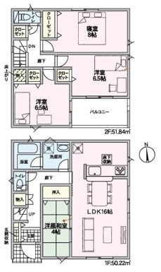 4LDK 1F/LDK 16.0帖 1室 1F/和室 4.0帖 1室 2F/洋室 8.0帖 1室 2F/洋室 6.5帖 2室 |