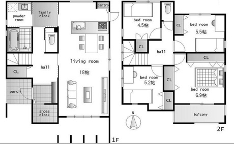 4LDK 1F/LDK 18.0帖 1室 2F/洋室 6.9帖 1室 2F/洋室 5.5帖 1室 2F/洋室 5.2帖 1室 2F/洋室 4.5帖 1室 |