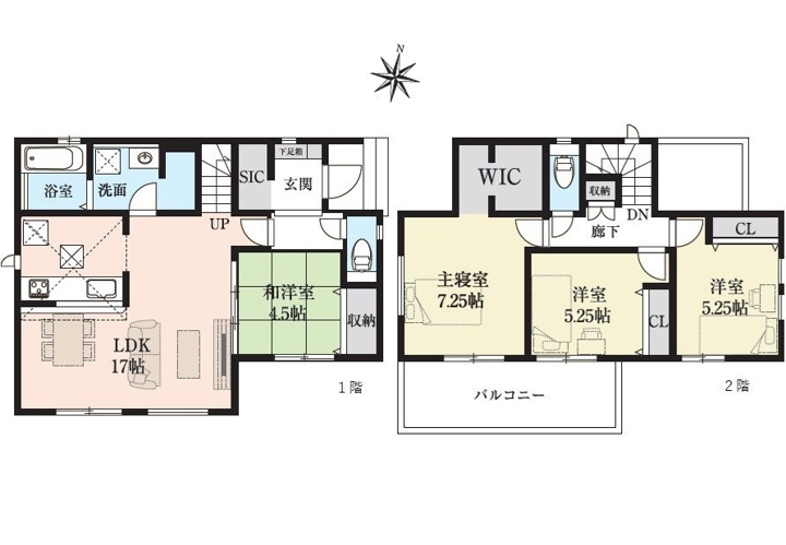 4LDK 1F/LDK 17.0帖 1室 1F/和室 4.5帖 1室 2F/洋室 7.2帖 1室 2F/洋室 5.2帖 2室 |