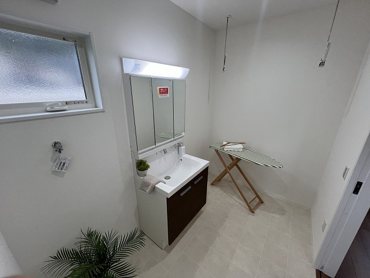 洗面脱衣所は広く、サンルームも備えた生活動線の良い4LDK物件です。