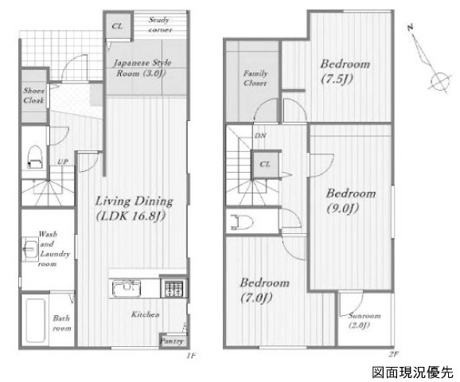 4LDK 1F/LDK 16.8帖 1室 1F/和室 3.0帖 1室 2F/洋室 9.0帖 1室 2F/洋室 7.5帖 1室 2F/洋室 7.0帖 1室 |