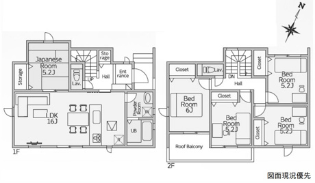 5LDK 1F/LDK 16.0帖 1室 1F/和室 5.2帖 1室 2F/洋室 6.0帖 1室 2F/洋室 5.2帖 3室 |