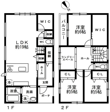 3LDK 1F/LDK 19.0帖 1室 2F/洋室 6.0帖 1室 2F/洋室 5.0帖 2室 |