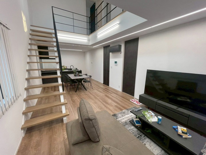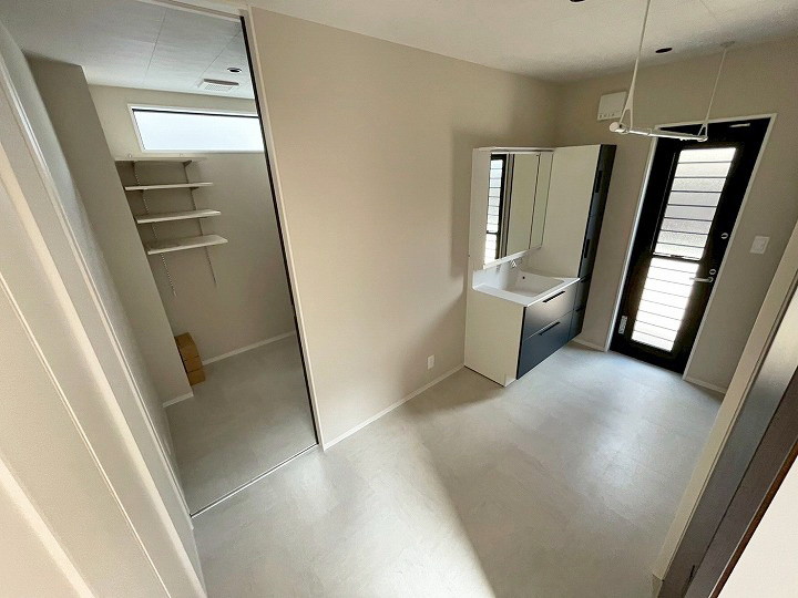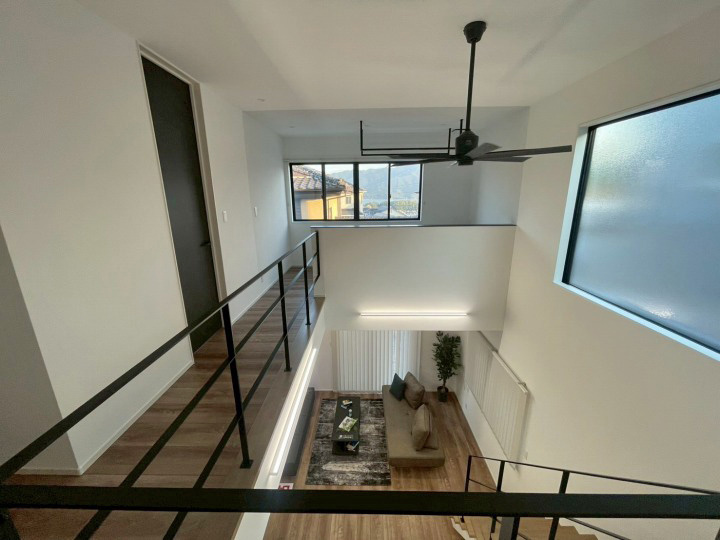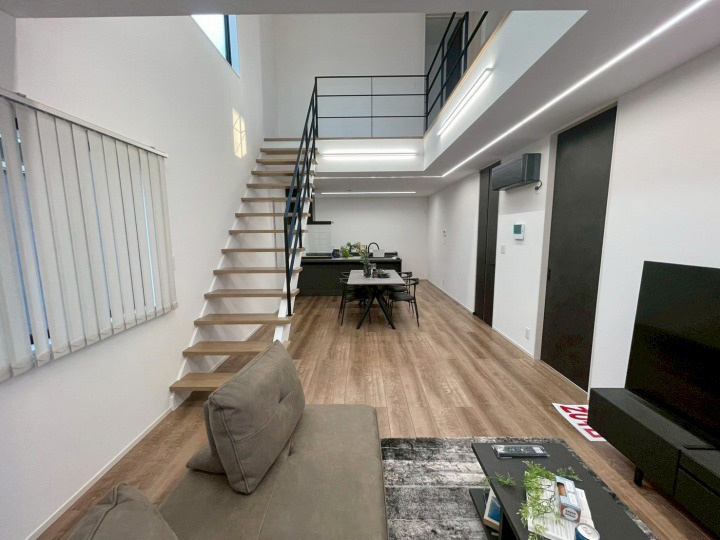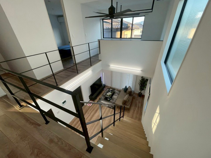 リビングには明るくて開放的な吹抜けと露出階段。広々とした洗面脱衣所に加え、