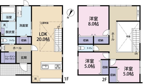 3LDK 1F/LDK 20.0帖 1室 2F/洋室 8.0帖 1室 2F/洋室 5.0帖 2室 |