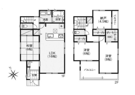 3LDK+1S(納戸) 1F/LDK 16.0帖 1室 1F/和室 6.0帖 1室 2F/洋室 8.0帖 1室 2F/洋室 6.0帖 1室 2F/S 4.5帖 1室 |