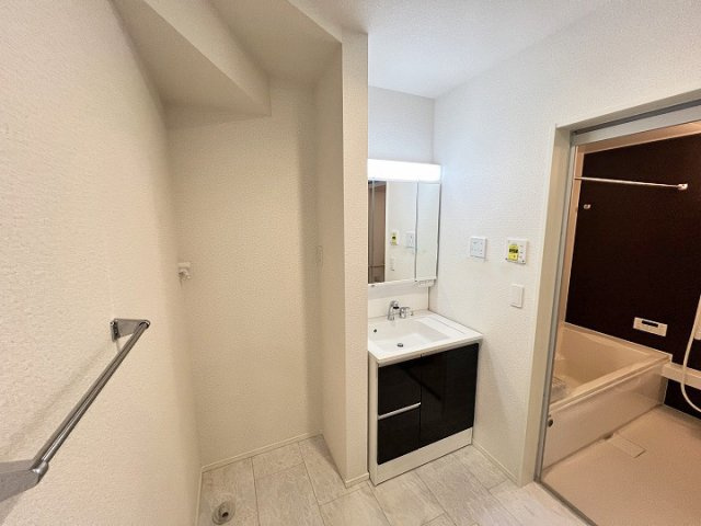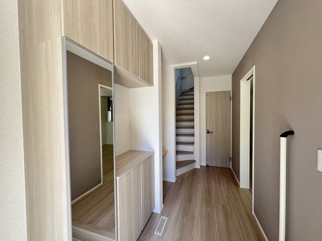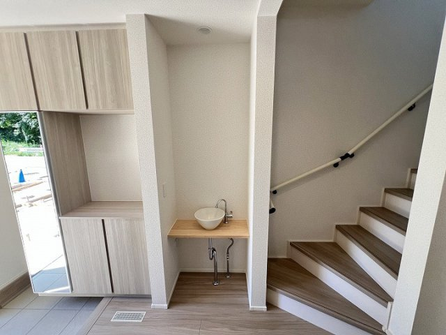 南西角地の陽当たり良好な4LDK。洗面所近くのユーティリティルームに室内物干しを設置し、家事動線に配慮した快適な住まいです。