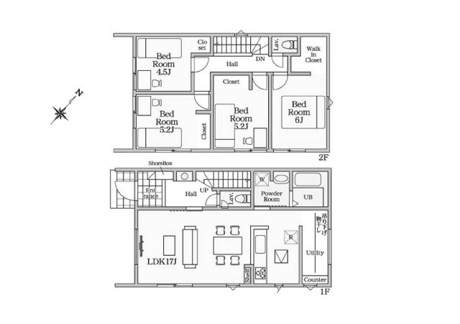 4LDK 1F/LDK 17.0帖 1室 2F/洋室 6.0帖 1室 2F/洋室 5.2帖 2室 2F/洋室 4.5帖 1室 |