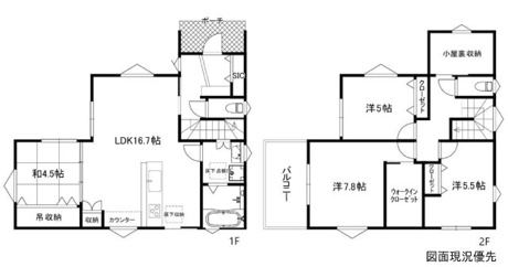 4LDK 1F/LDK 16.7帖 1室 1F/和室 4.5帖 1室 2F/洋室 7.8帖 1室 2F/洋室 5.5帖 1室 2F/洋室 5.0帖 1室 |