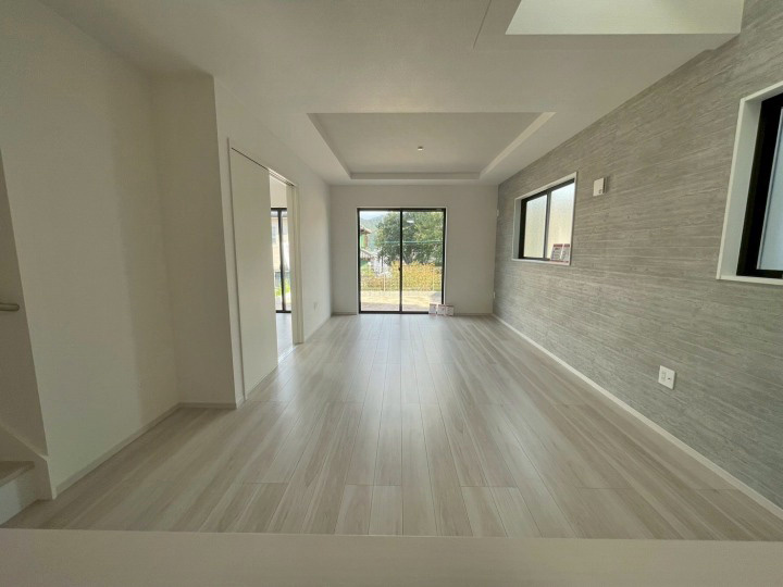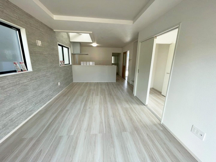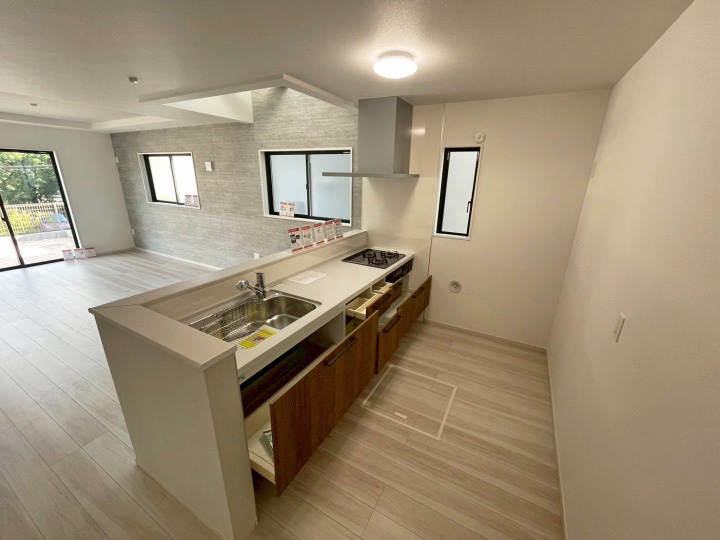 閑静な住宅地オープンハウスバルコニープロパンガス公営水道公共下水2面バルコニーシステムキッチン対面式キッチン温水洗浄便座トイレ2ヶ所床下収納ウォークインクロゼットTVモニタ付インターホン住戸内覧可能リビング階段完成済み