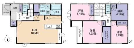 3LDK+1S(納戸) 1F/LDK 18.5帖 1室 2F/洋室 7.2帖 1室 2F/洋室 5.4帖 1室 2F/洋室 5.2帖 1室 2F/S 4.1帖 1室 |