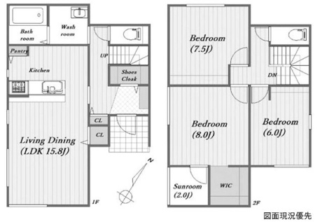 3LDK 1F/LDK 15.8帖 1室 2F/洋室 8.0帖 1室 2F/洋室 7.5帖 1室 2F/洋室 6.0帖 1室 |