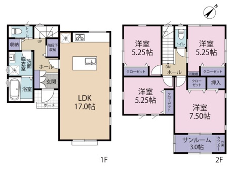 4LDK 1F/LDK 17.0帖 1室 2F/洋室 7.5帖 1室 2F/洋室 5.2帖 3室 |