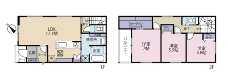 3LDK 1F/LDK 17.1帖 1室 2F/洋室 7.0帖 1室 2F/洋室 5.6帖 1室 2F/洋室 5.5帖 1室 |