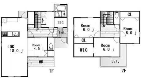 4LDK 1F/LDK 18.0帖 1室 1F/和室 4.5帖 1室 2F/洋室 6.0帖 3室 |