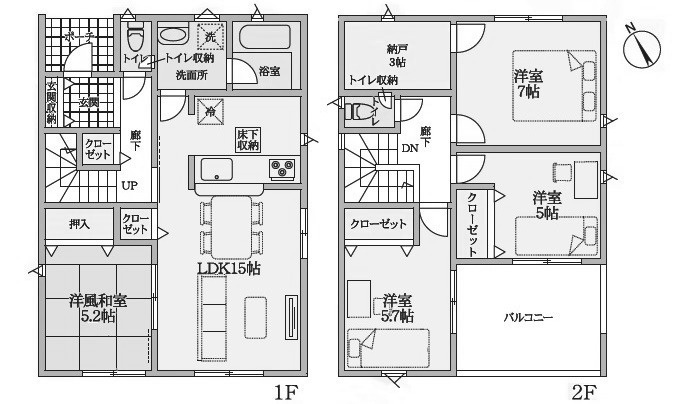 4LDK+1S(納戸) 1F/LDK 15.0帖 1室 1F/和室 5.2帖 1室 2F/洋室 7.0帖 1室 2F/洋室 5.7帖 1室 2F/洋室 5.0帖 1室 2F/S 3.0帖 1室 |