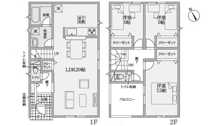 3LDK 1F/LDK 20.0帖 1室 2F/洋室 7.5帖 1室 2F/洋室 5.0帖 2室 |