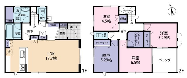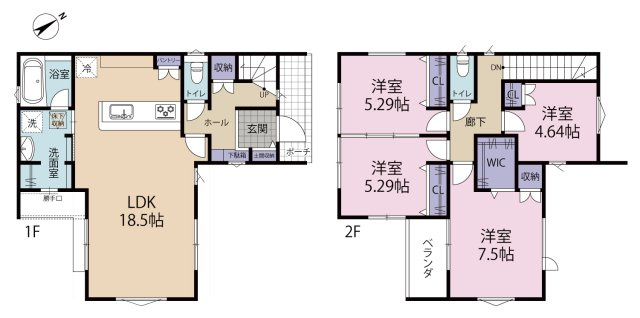 ヴェルコート皆賀4丁目 No.4 4LDK LDKはゆとりの18.04帖。玄関にはホール収納を備え、LDKにも収納+パントリーを配置しています。洗面脱衣所は広々1.5坪のサイズで使い勝手良好。主寝室には室内物干しを設置し、駐車は2台分可能です。