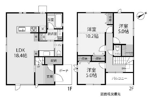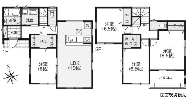 都市型の2階建て住宅。3LDKに加え、パントリーとウォークインクローゼットを備えた、収納が充実した家です。並列で2台の駐車が可能。防犯性の高い雨戸シャッター付き。前面道路は幅6mでゆとりがあります。