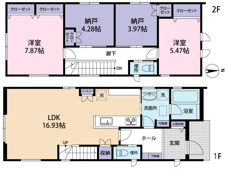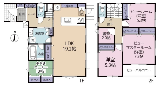 ヴェルコート観音台1丁目No.1 3LDK+タタミコーナー住宅。 リビングにはパントリーと収納を完備し、洗面脱衣所は広くゆとりのある設計。 2階には書斎を配置し、収納も充実した機能的な間取りが特徴です。