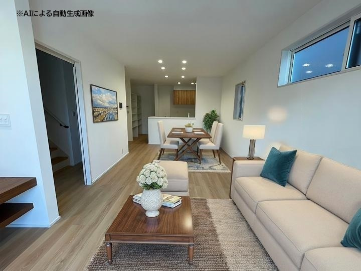 都市型平屋住宅(建築基準法上は2階建て)。3LDKに小屋裏物置を備えた間取りです。 リビングには吹き抜けを設け、採光をたっぷり取り入れることで、明るく開放的なモダンな空間に仕上げています。ゆめタウン大竹まで徒歩6分という便利な立地にあり、平屋設計のため、ライフスタイルが変化しても長く快適に住み続けられる家です。