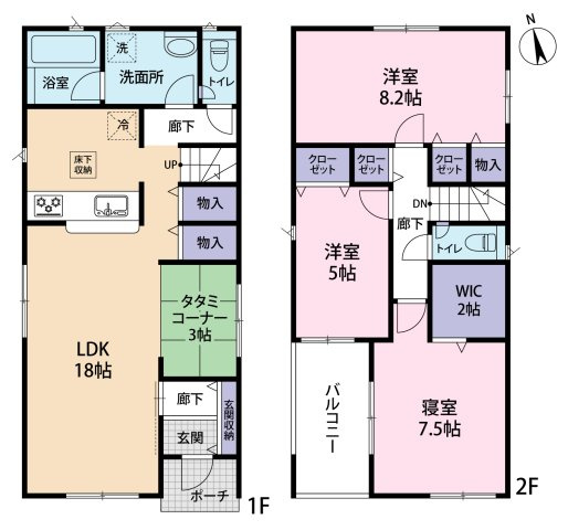 住宅性能評価+長期優良住宅取得の耐震等級3(制振ダンパー付き)で安心の住まい。 前面道路7mで交通量も少なく、駐車しやすい立地です。 1階は18帖のLDKに5帖洋間、広めの洗面脱衣所には室内物干しを備えた生活しやすい間取りです。