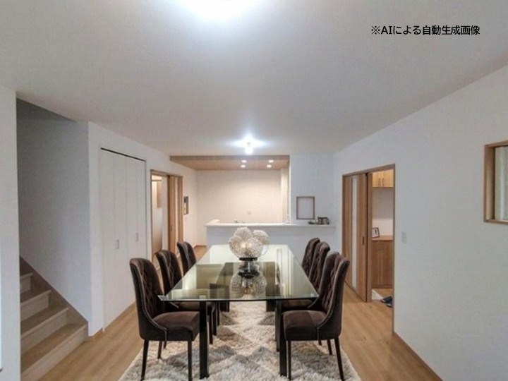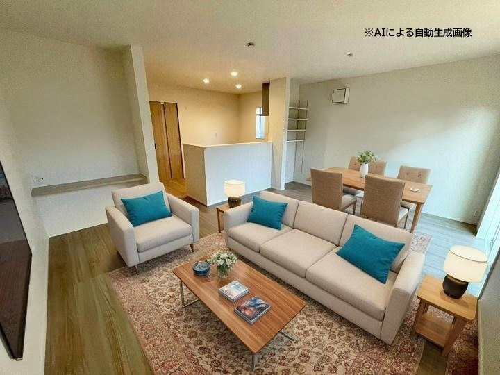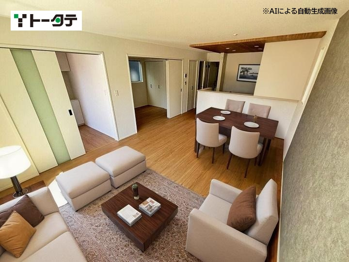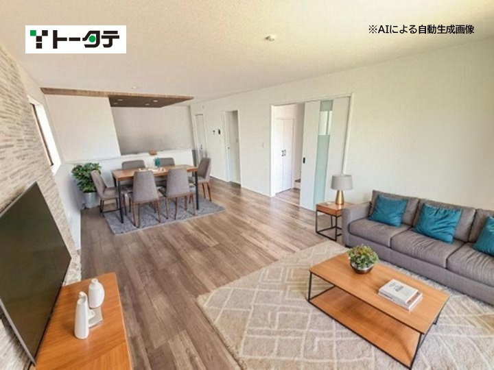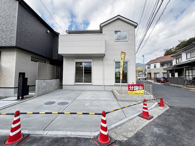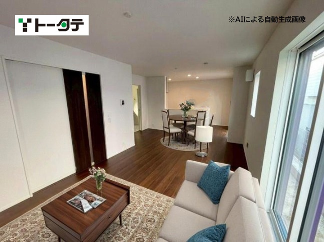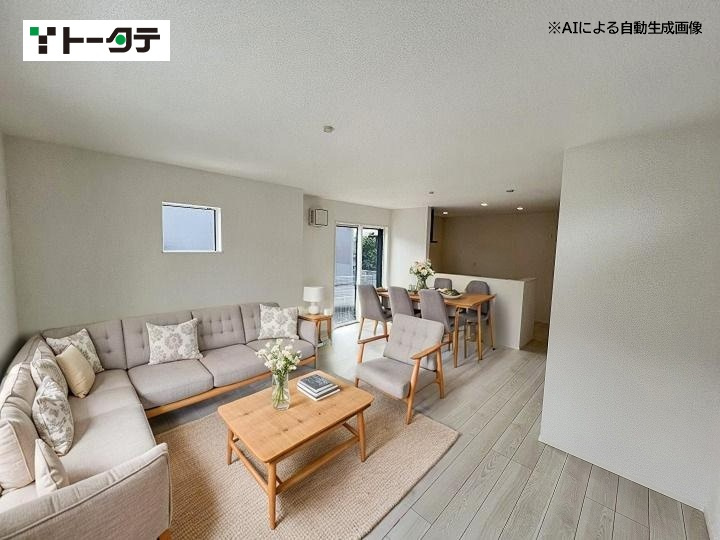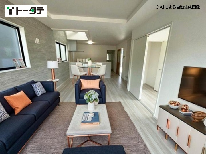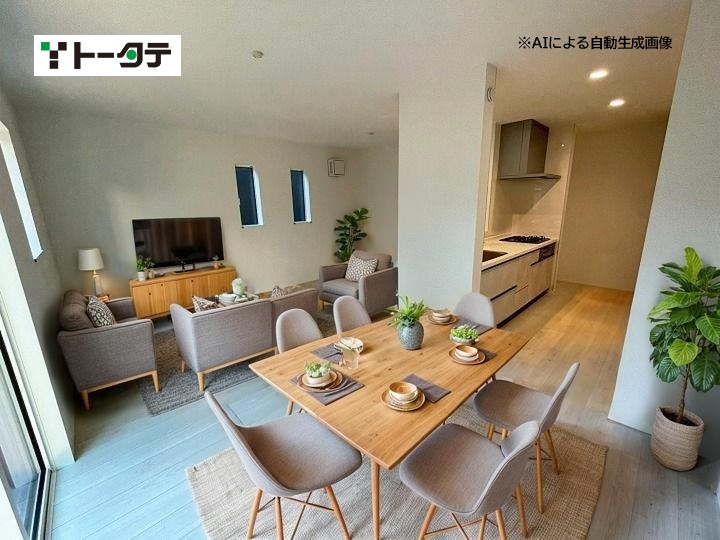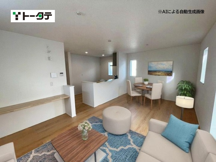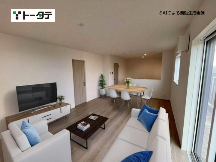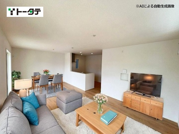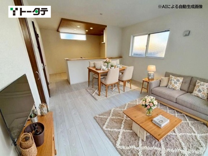 平屋のモデル分譲住宅です(エアコン4台、カーテン、照明付き)。 建具はハイドア仕様で、開放感のある設計が特徴です。玄関ホールにはエコカラットを採用し、おしゃれな空間を演出しています。 また、和室にはホスクリーンを設置し、室内干しが可能です。新築未入居の物件です。