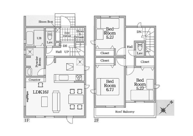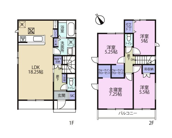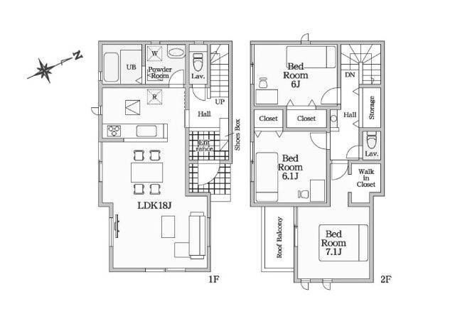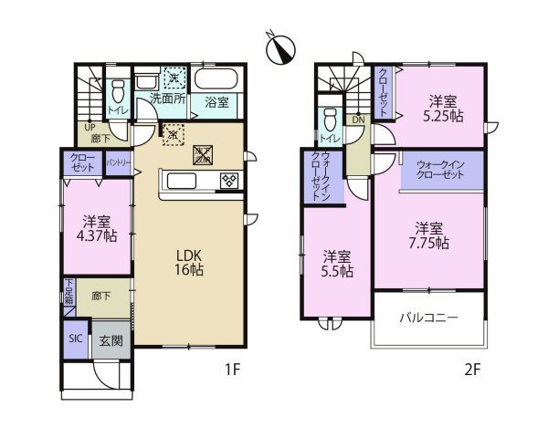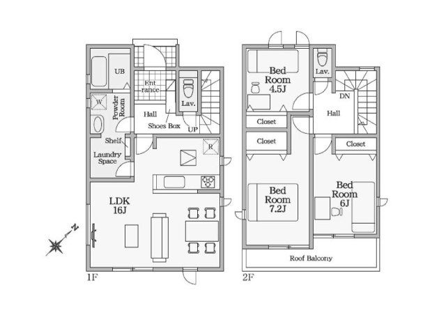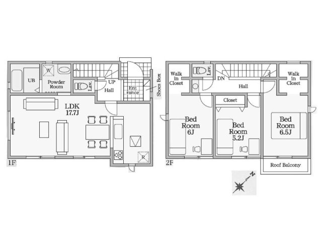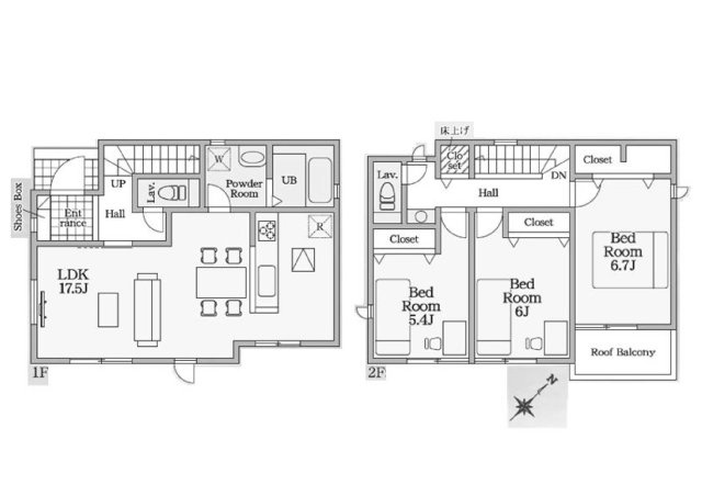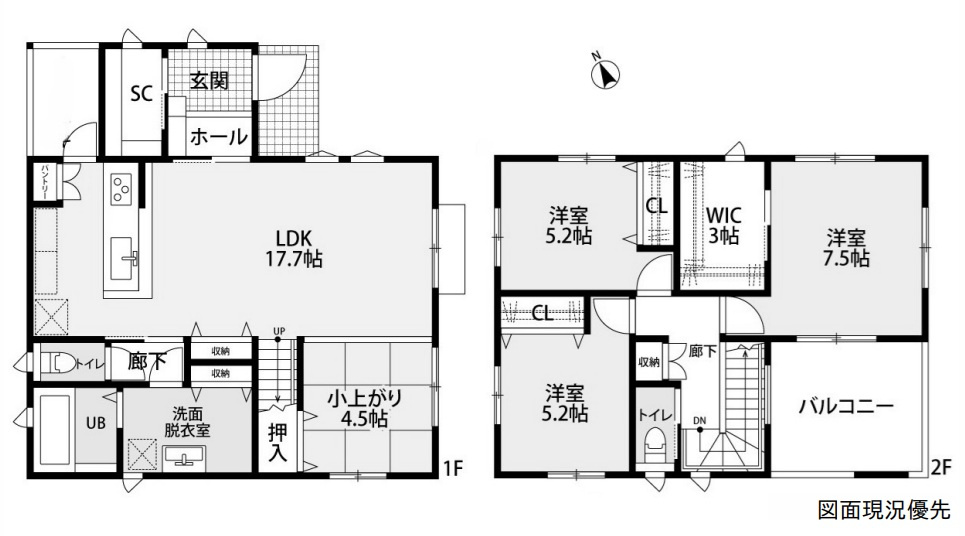 1階は17.7帖のゆとりあるLDKに小上りの和室を備え、上質な開放感を演出。 SICや和室下収納、広々とした洗面脱衣所やパントリーなど多彩な収納が暮らしを美しく整えます。さらに屋根付きバルコニーは、急な雨から大切な洗濯物を守り、日常に安心をもたらします。子育て世帯にも優しい配慮が施された、機能性と快適性を兼ね備えた邸宅です。