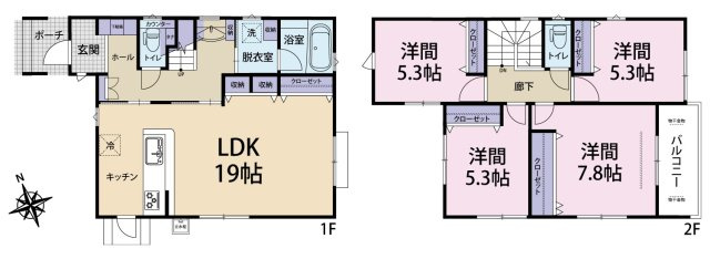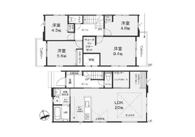 4LDK(5LDKに変更可)。2階12.7帖の洋室は間仕切りで2部屋として利用可能です。 LDKは折上天井と吹抜けで開放感を演出。さらに両面道路に面し、明るく心地よい住まいです。