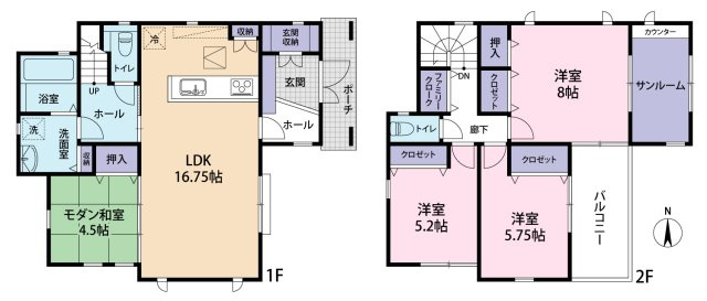 16.75帖のLDKに4.5帖の和室を備えた、建坪32坪超の4LDK。 随所に収納を設け、サンルーム+バルコニーで家事動線も快適。さらに住友ゴム製制振ダンパー「マモリー」を搭載し、安心の住まいです。駐車は3台可能。