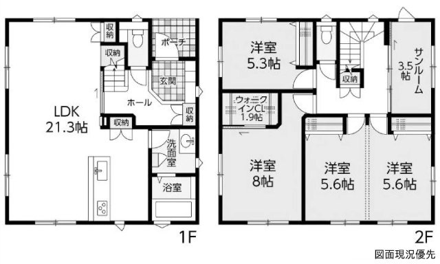 4LDK(5LDKに変更可)。2階12.7帖の洋室は間仕切りで2部屋として利用可能です。 LDKは折上天井と吹抜けで開放感を演出。さらに両面道路に面し、明るく心地よい住まいです。