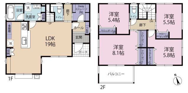 19帖の広々LDKには造作カウンターを設置。SICやストレージ、可動棚など収納力に優れた間取り設計です。 2階は4部屋あり、主寝室にはホスクリーンを標準装備。約4帖の広々バルコニーも魅力の収納充実4LDKです。