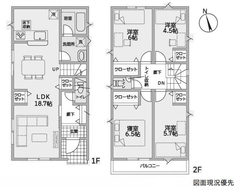 1階は15.7帖超のLDKと4.5帖和室を備えた広々空間。防犯性に優れたシャッター付きです。 2階は全室6帖以上の洋室が3部屋あり、開放感のある広々バルコニーも魅力です。 未完成ですがモデルハウスがございます。お気軽にお問合せください。
