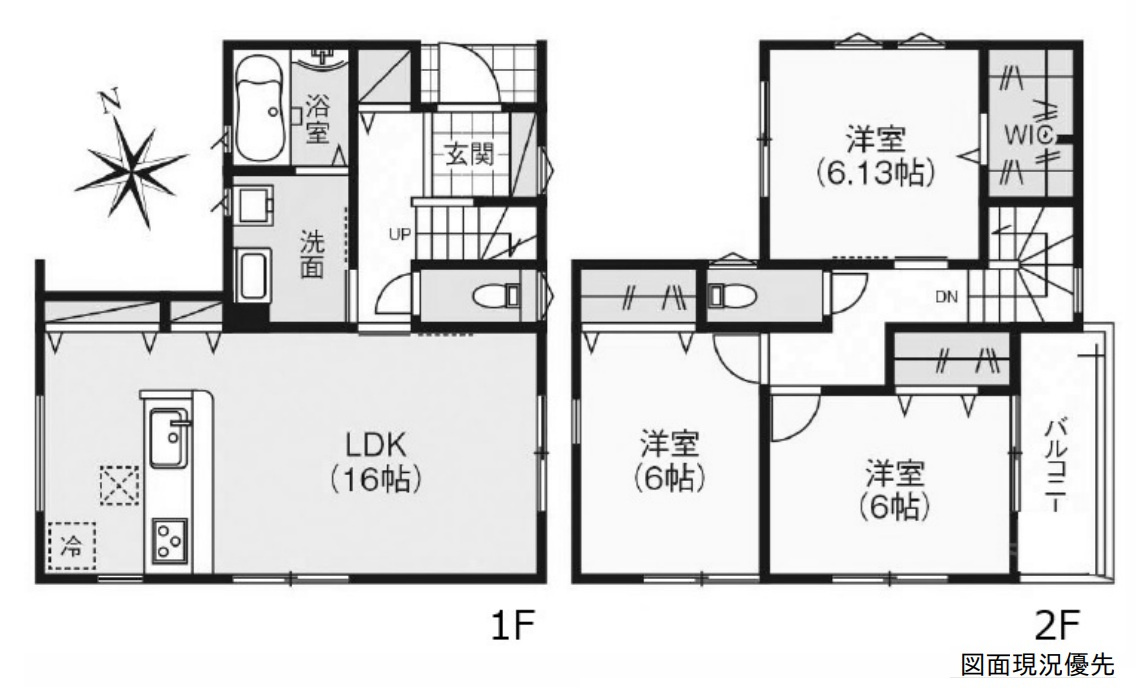 3LDK、駐車2台可能な角地。洗面脱衣室は1坪超えの広さを確保し、ゆとりあるプランニングです。1階には防犯面にも配慮した雨戸シャッターを設置しています。
